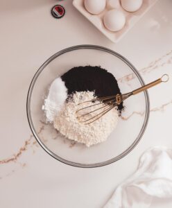 - While the beer is reducing, whisk 1 cup of all purpose flour with 1/2 cup of dark dutch cocoa powder, 1 teaspoon of baking powder, 1 teaspoon of baking soda and 1 teaspoon of salt in a large bowl