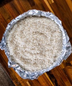 Once the dough is very cold, cover the tart dough with foil. Press the foil down against the dough and fill the entire center with pie weights or dry rice (photo above).