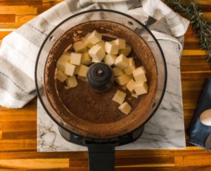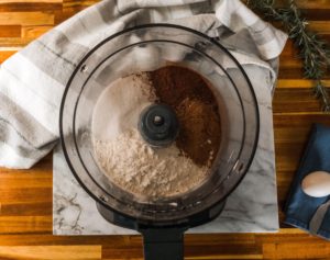 Add the cold butter cubes and pulse until the texture resembles a coarse damp sand. This should take 12-15 pulses. I recommend draping a kitchen towel over the food processor during this stage, as the cocoa powder can puff out a bit during the first several pulses.