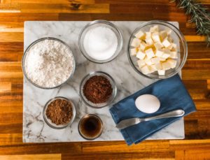 Start by gathering 1 1/4 cups of all purpose flour, 3 tablespoons of special dark cocoa powder, 2 tablespoons of unsweetened cocoa powder, 1/3 cup of granulated sugar, 1 tablespoon of vanilla extract, 1 large egg and 13 tablespoons of cold, cubed salted butter.