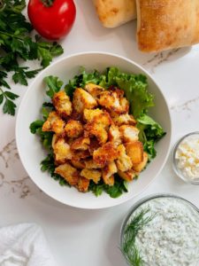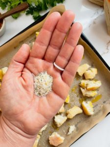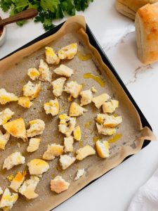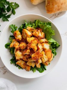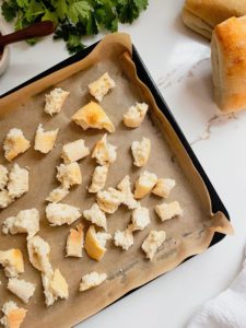 For the seasoning, I always keep some garlic salt with parsley in my pantry and this works perfectly on these croutons, but if you do not have this on hand then a teaspoon of garlic powder and a big pinch of sea salt will work great too!