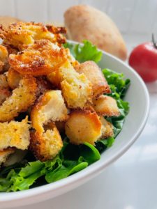 They have crunchy edges, but chewy centers and soak up both the seasoning and the flavors of your salad dressing really well! You are going to love these croutons.