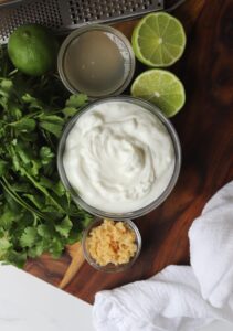 To begin, gather 2/3 cup of plain Greek yogurt or Mexican crema, 1 clove of garlic, 1/2 teaspoon of salt, a pinch of black pepper, 1/2 cup of fresh cilantro, 1 tablespoon of freshly squeezed lime juice and 1 teaspoon of lime zest.