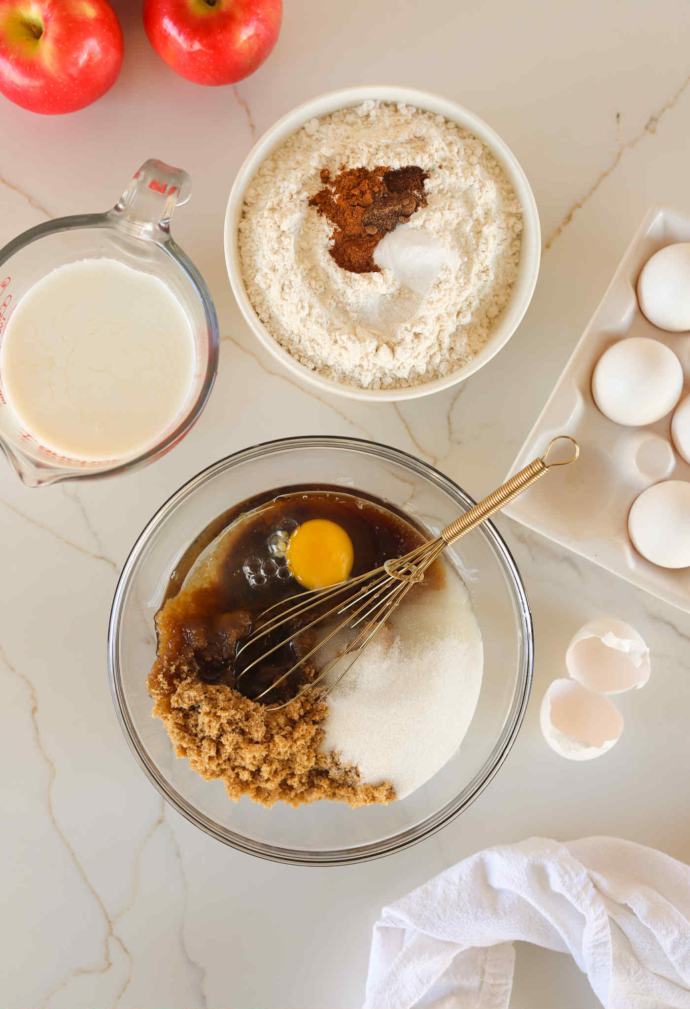 Start by whisking a cup of brown sugar with 1/2 cup of granulated sugar, 1/2 cup of a neutral oil, a large egg and 2 teaspoons of pure vanilla extract until fully combined.