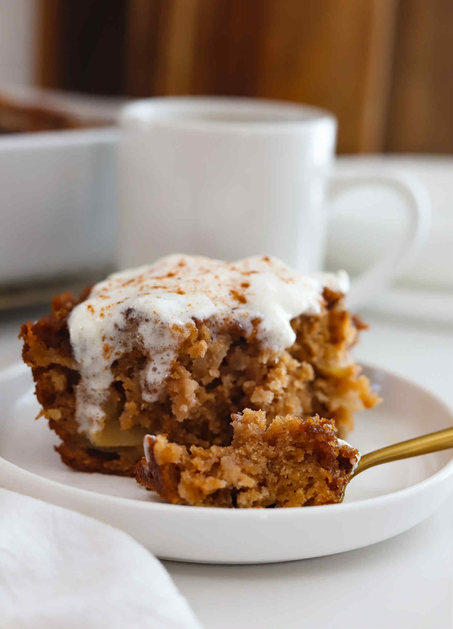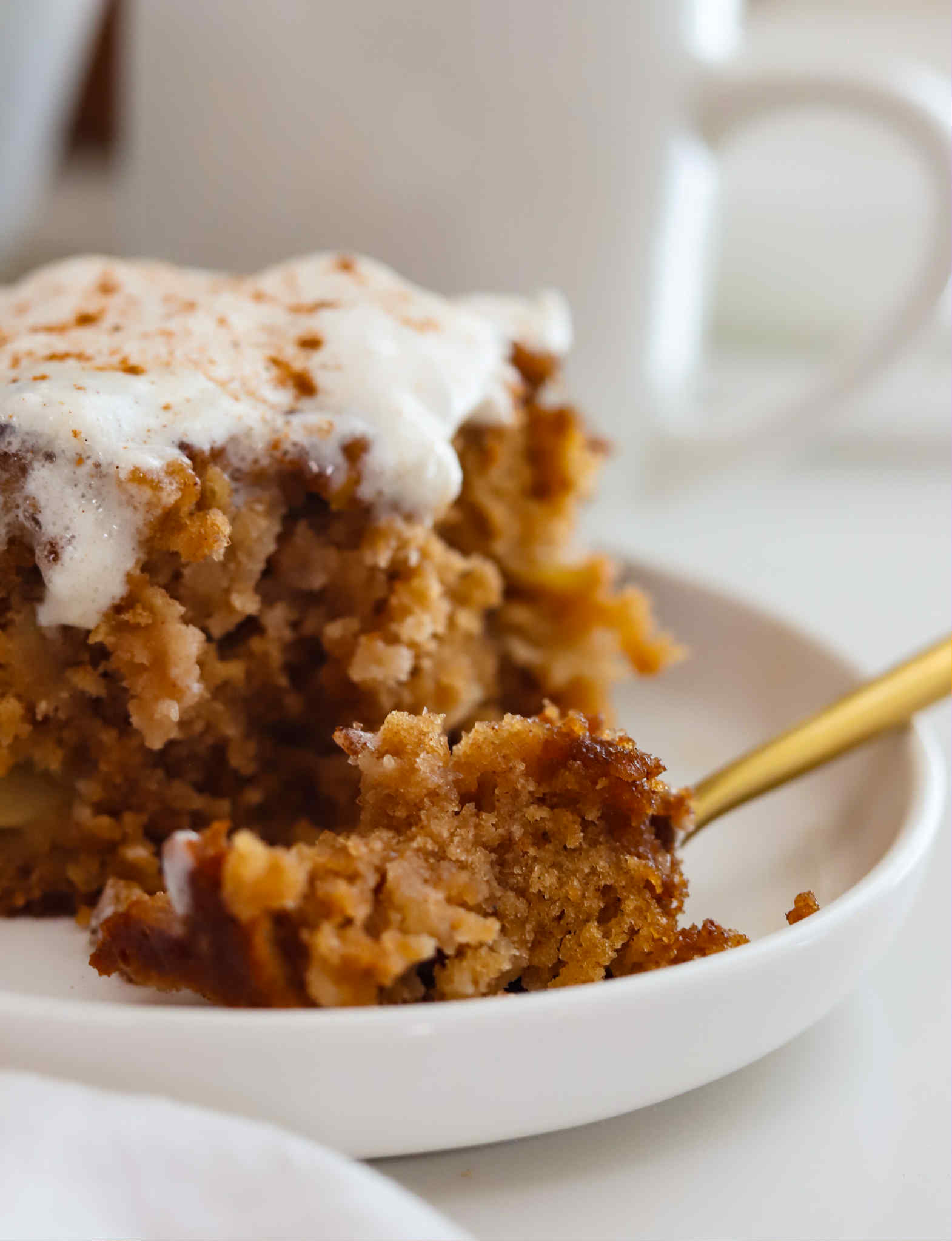 This cake is beautifully moist with a tender crumb and the absolute best flavors. Those apples, even though they weren’t peeled, are soft, sweet and juicy and they are all over this cake, so every bite is fantastic and full of flavor.