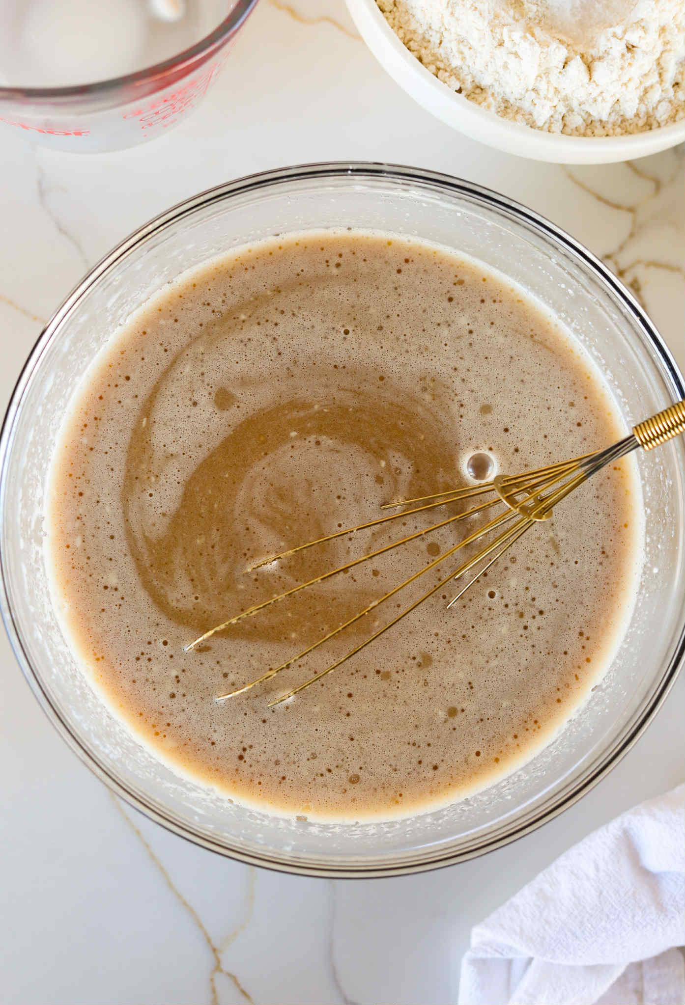 - In a large bowl, whisk 1 cup of brown sugar with 1/2 cup of granulated sugar, 1/2 cup of a neutral oil, a large egg and 2 teaspoons of vanilla extract until fully combined