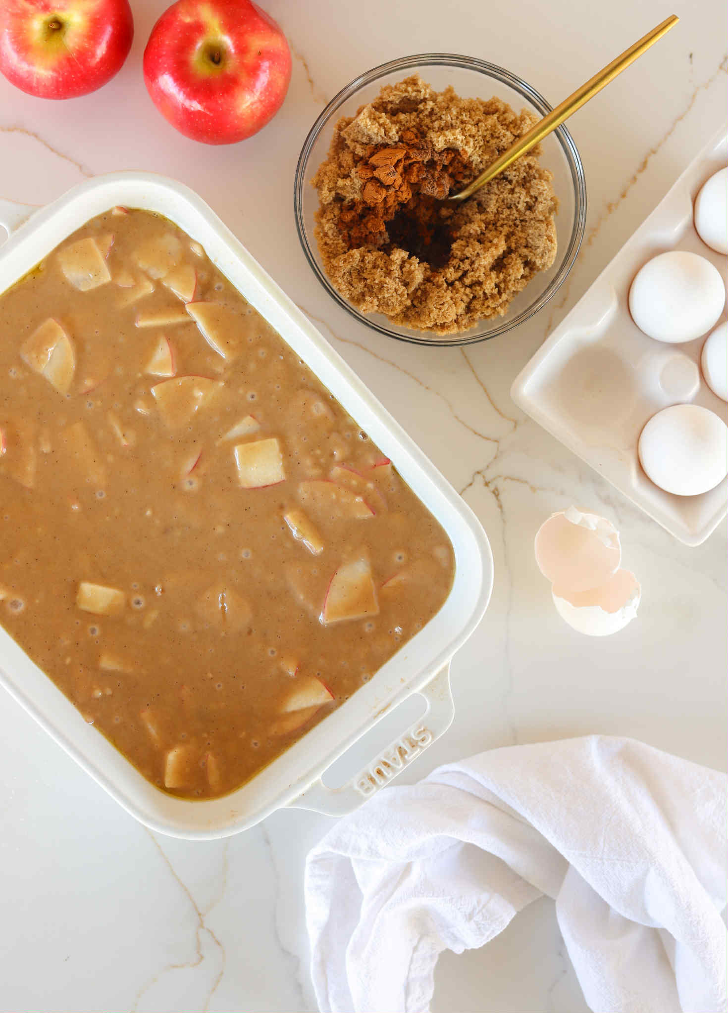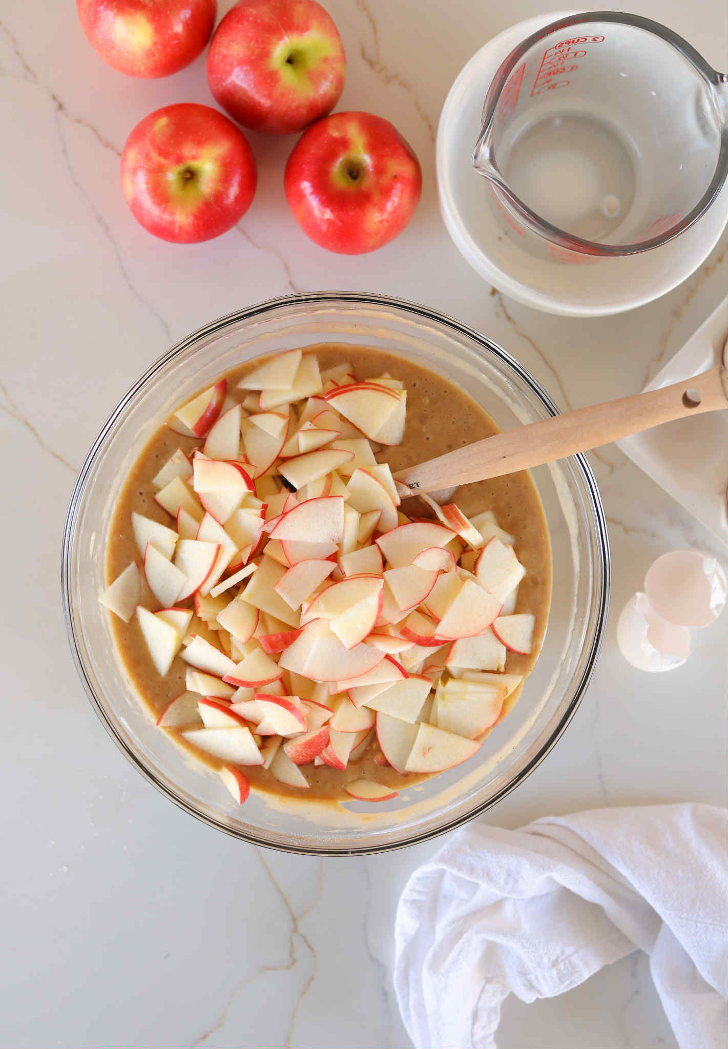After adding 3 large thinly sliced apples into the batter and mixing until they are evenly distributed, pour the batter into a greased and parchment lined baking dish.