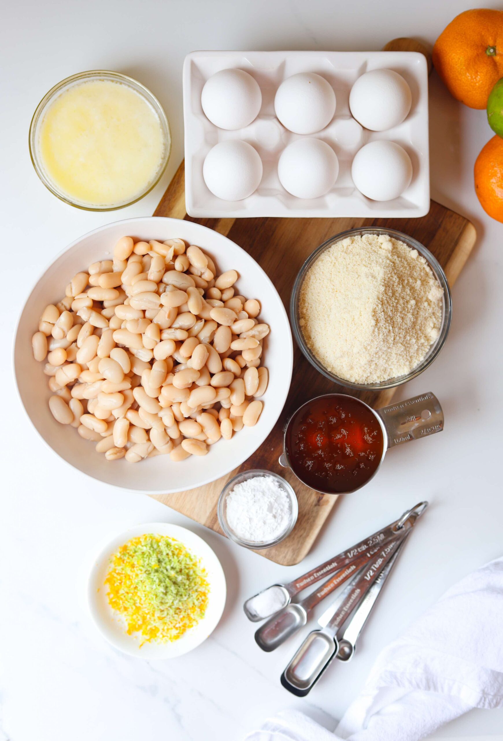 You’ll need 29 ounces of cannellini beans, 210 grams of honey, a teaspoon of vanilla extract, 2 tablespoons of fresh citrus juice, 1 tablespoon of fresh citrus zest, 4 large eggs, 110 grams of almond flour, 2 teaspoons of baking powder, 100 grams of melted butter and 1/4 teaspoon of sea salt.
