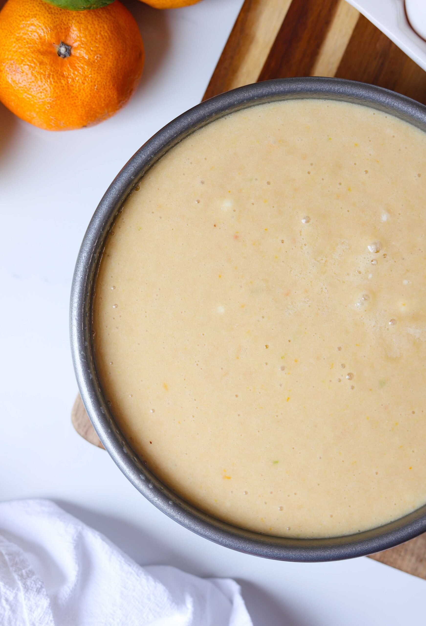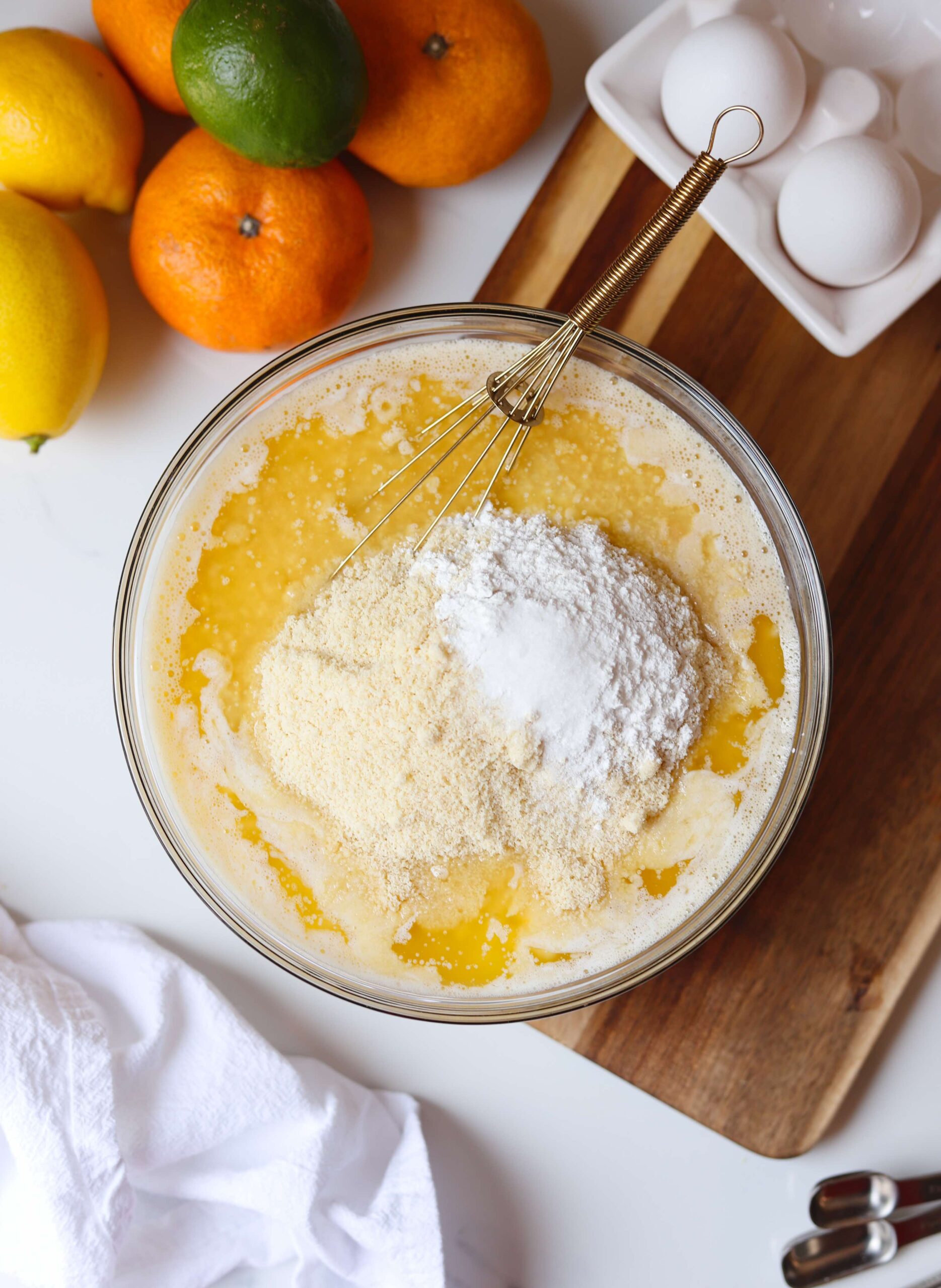 Transfer this mixture into a bowl and add the almond flour, baking powder, salt and melted butter. Mix until the dry ingredients are incorporated and then transfer the batter into your cake pan.
