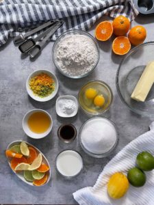 Begin by gathering 8 tablespoons of room temperature butter, 1 cup of granulated sugar, 2 large eggs, 1 teaspoon of vanilla extract, 1/4 teaspoon of citrus extract, 1 and 1/2 cups of all-purpose flour, 2 teaspoons of baking powder, 1/4 teaspoon of salt, 1/4 cup of whole milk, 1 tablespoon of citrus zest, 1/4 cup of lime juice and 1/4 cup of orange juice.