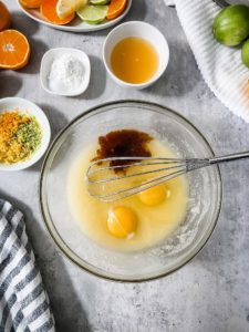 - Add 2 eggs, 1 teaspoon of vanilla extract and 1/4 teaspoon of citrus extract and whisk to combine
