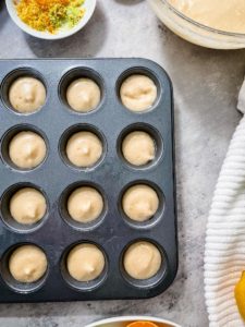 Now that your beautiful citrus batter is ready to go, fill greased cupcake tins half way… only half way! This batter fluffs up a lot as it bakes, so filling your tins half way will result in perfectly shaped cupcakes with a nice little crown.