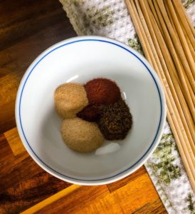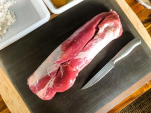 Once all of the skewers are loaded, season the tenderloin with our seasoning mixture.