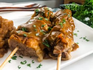 - Place the cooked city chicken onto plates and top with some pan gravy