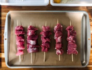 Now that we are ready to go, begin cubing your tenderloin into equally sized cubes of about 1 to 1 1/2 inches. Place 5 or 6 cubes onto each skewer and then place them onto a parchment lined baking sheet.