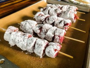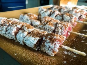 - Dip the skewers into the flour, the whisked and seasoned eggs and then the flour once more
