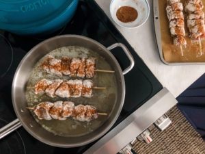 While the pan is heating up, season the skewers again by sprinkling a bit more seasoning over the coated tenderloin.
