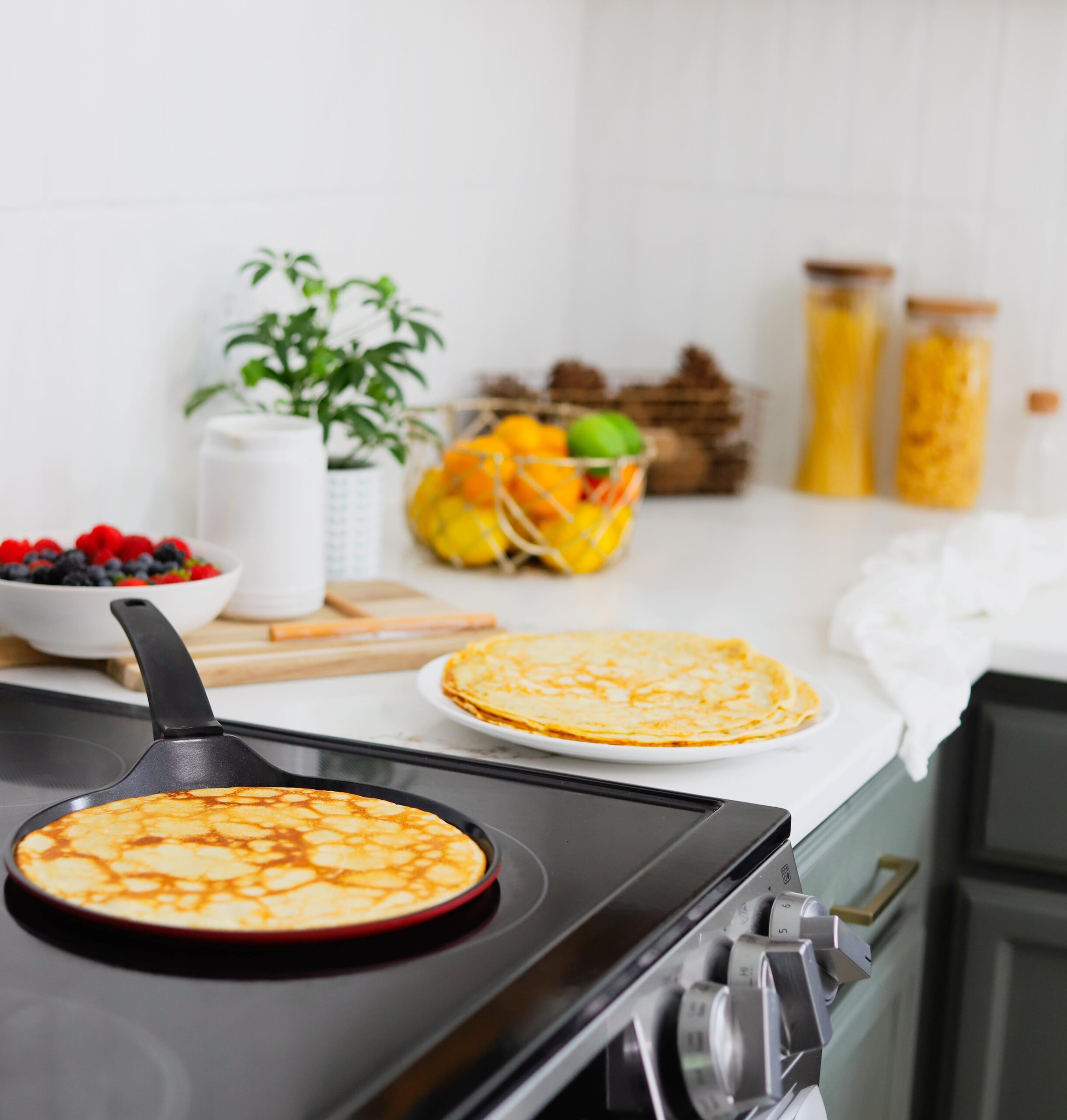 • Pour 1/4 cup of batter into the warm, greased pan and swirl the pan or use a crepe tool to work the batter out evenly throughout the pan