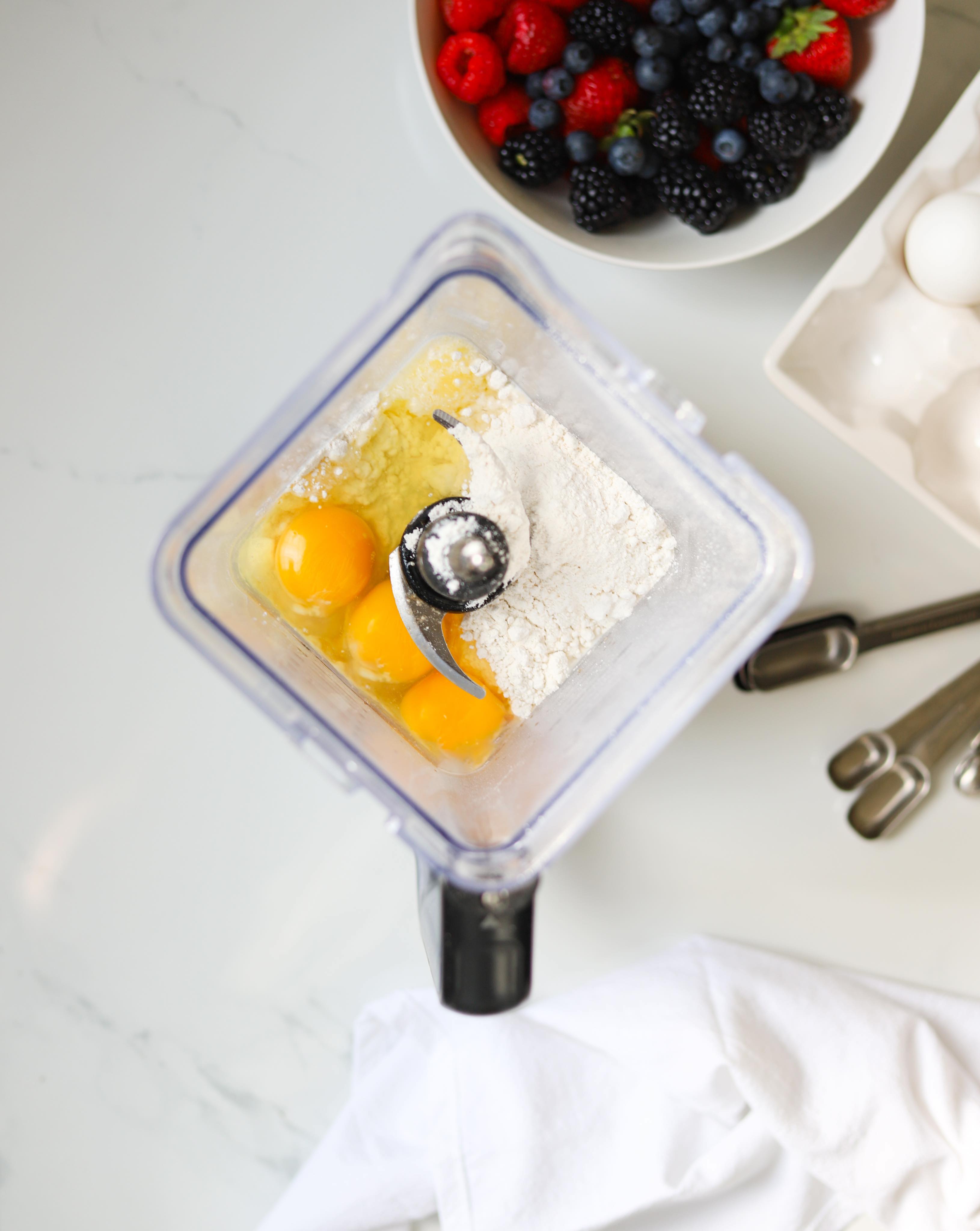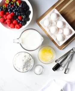 You will need 1/4 cup of melted butter, 165 grams of sifted all purpose flour, 1 tablespoon of granulated sugar, 1/4 teaspoon of fine salt, 2 cups of whole milk, 3 large eggs and 1 teaspoon of vanilla extract. Simple, right?