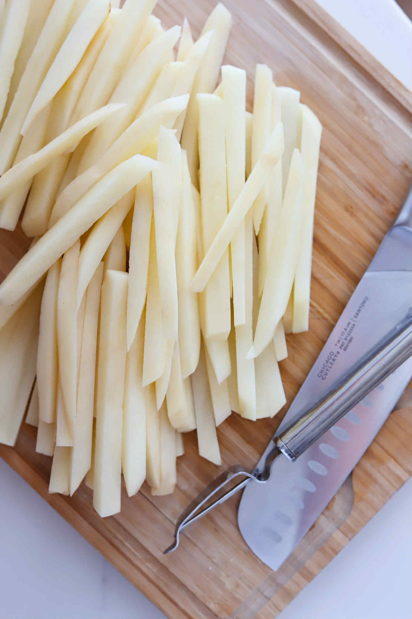 - Peel 3 large russet potatoes, rinse them off and slice them into long, thin fries
