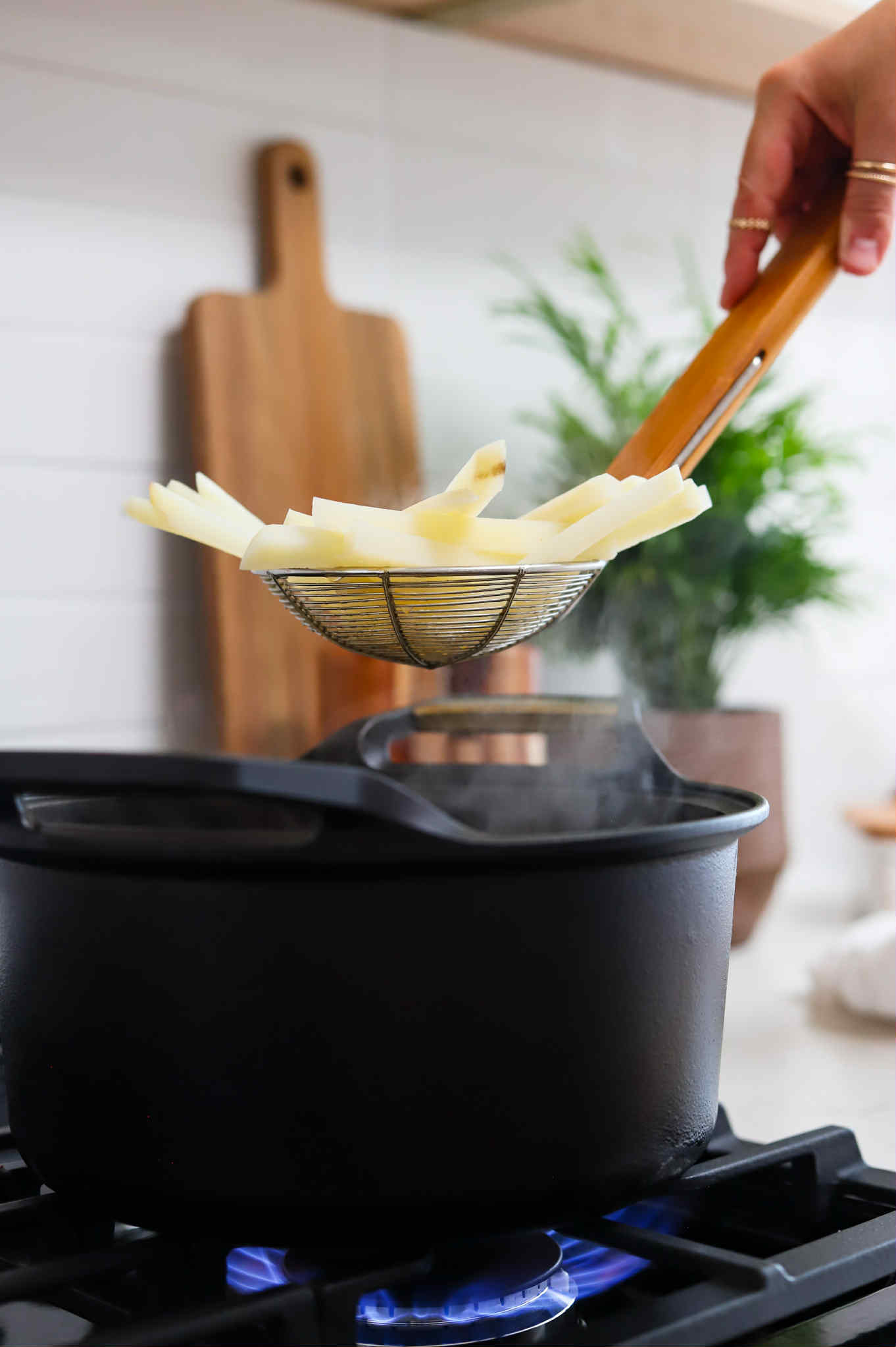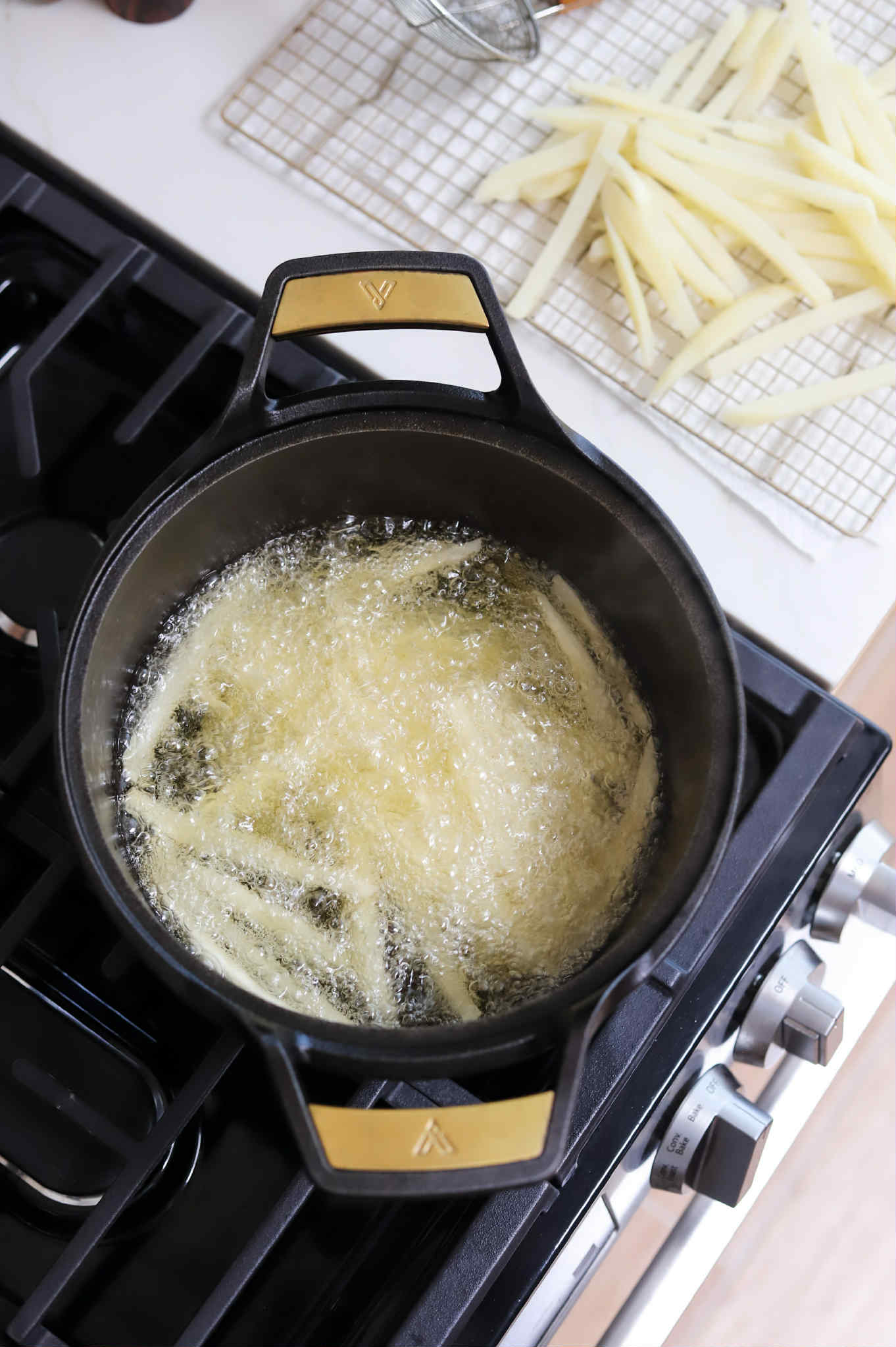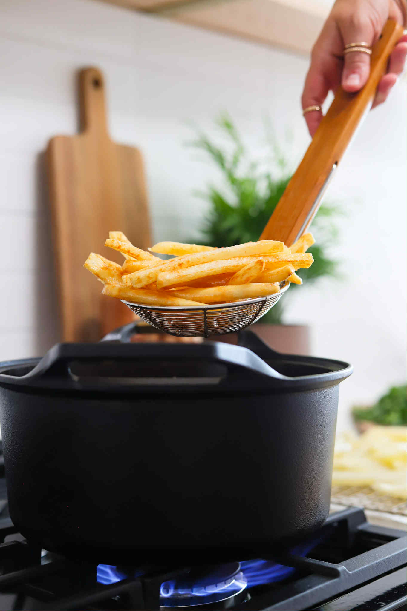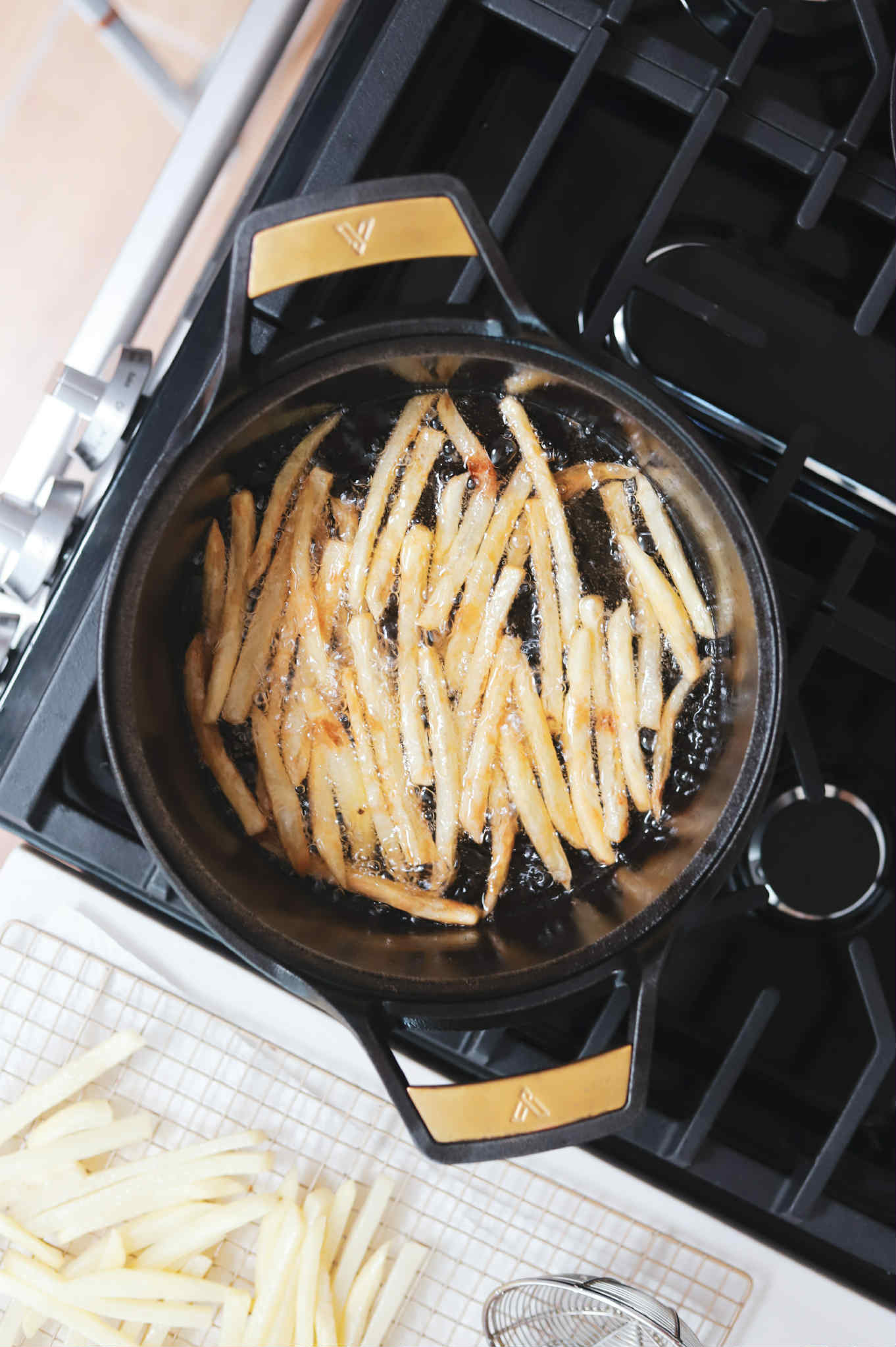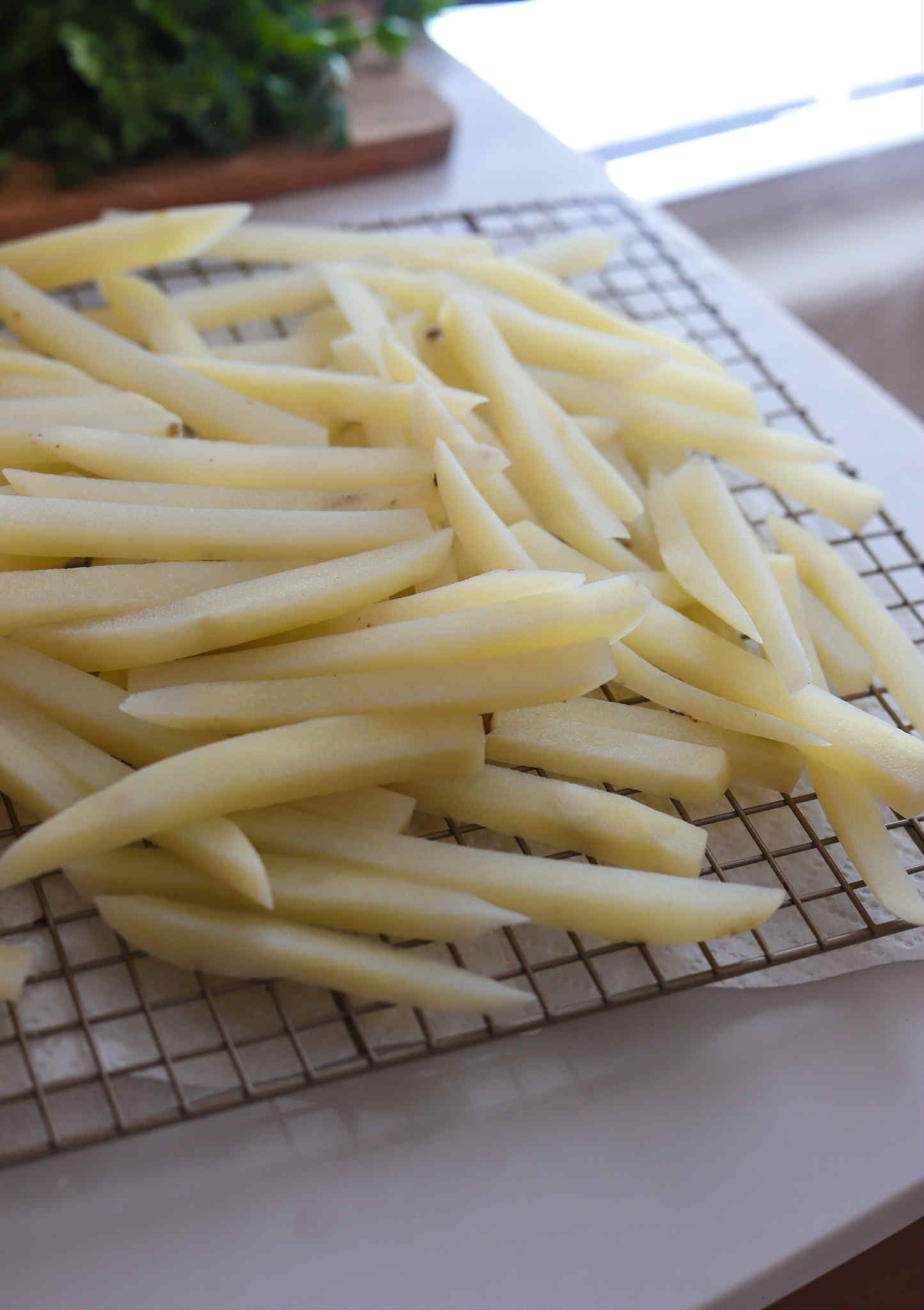 Note: This step can be done in advance to prep all of your fries up to the point of the final fry, so once your main course is resting, you can quickly do the final fry and have hot, crispy fries all ready to enjoy!