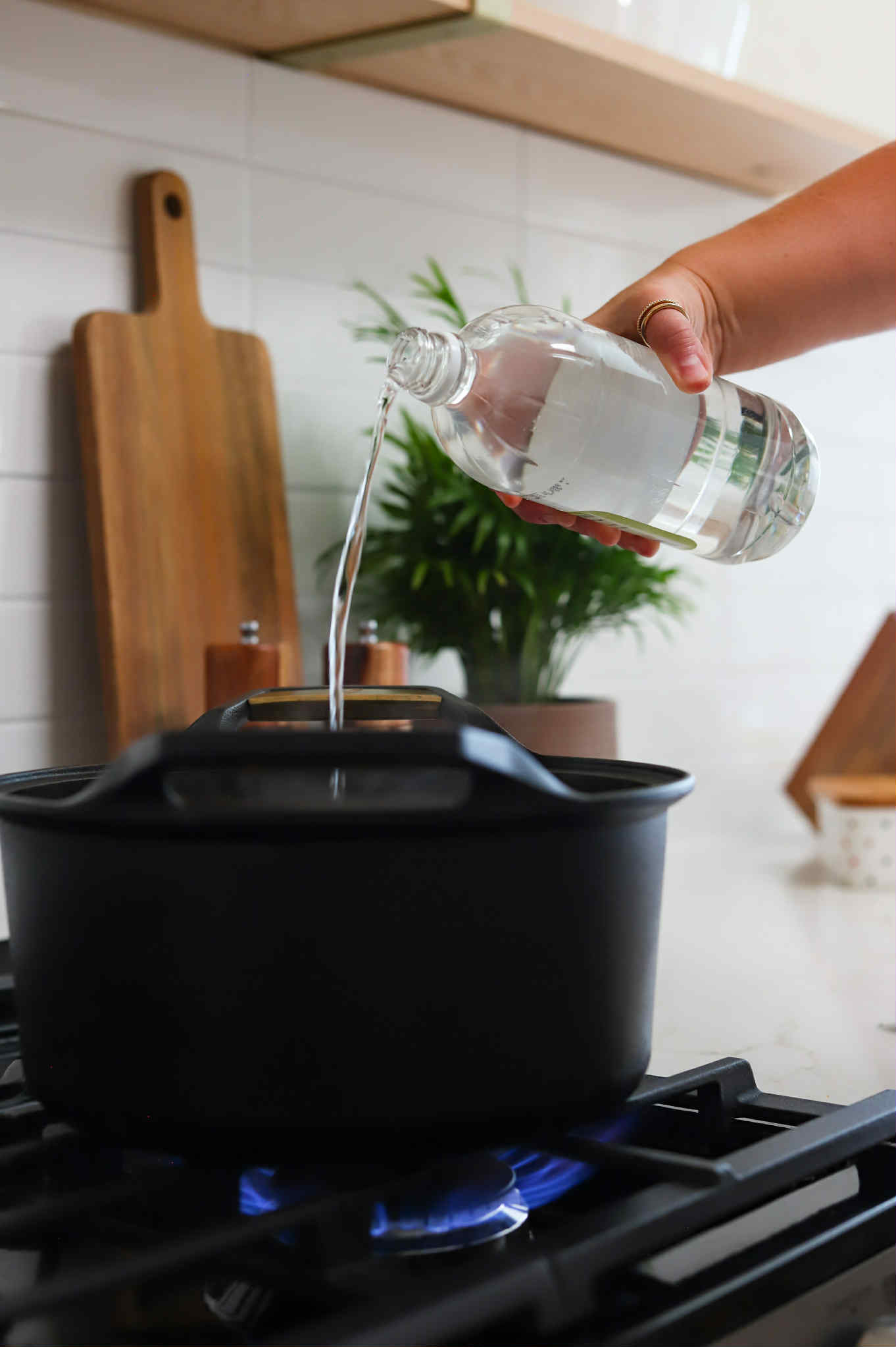 If you are wondering why we are adding white vinegar, it helps to slow down the potatoes break down process as they boil. We are boiling them to start their cooking process, not make them soft enough to fall apart and white vinegar will help with that. Don’t worry, you won’t taste the vinegar at all!