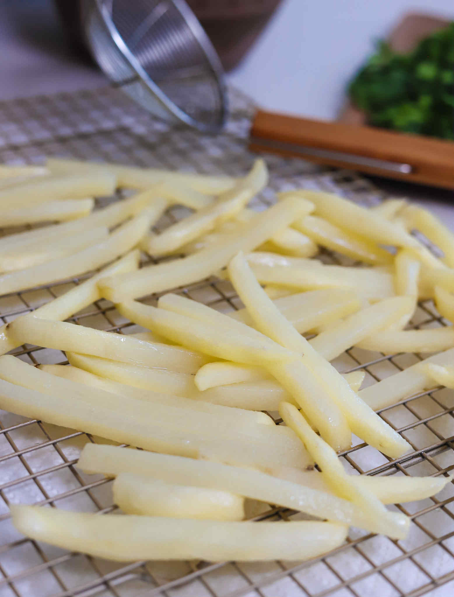 Potatoes have loads of starch and the excess starch can prevent your fries from getting crisp, so we need to get rid of as much of it as possible. This can be done by soaking, rinsing or par-boiling the fries.