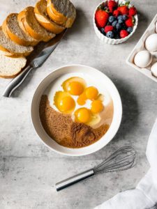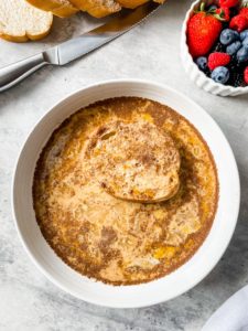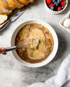Whisk the ingredients until the eggs are completely broken down and everything is fully combined. This batter is enough to generously soak about 8 thick slices of french bread, which is my favorite bread to use for french toast, but you could also use 10-12 thinner slices of bread.