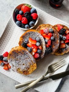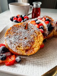 Transfer your golden brown french toast onto a plate, add some berries and maybe a dusting of confectioners sugar and breakfast is served…