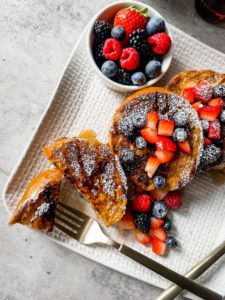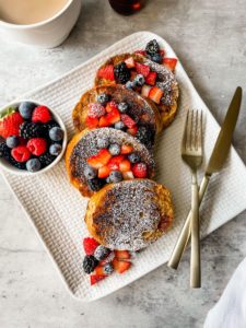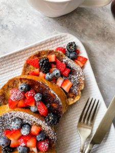 - Transfer the french toast onto plates, top with fresh fruit and a dusting of confectioners sugar