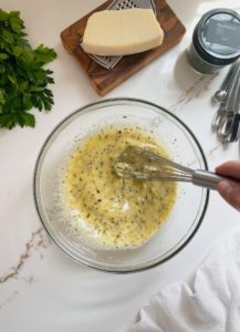 Start by combining all of the ingredients in a large bowl and whisk vigorously until everything is completely combined. The dressing should be a light pale yellow color and all of the parmesan and herbs should be evenly distributed and fully incorporated.