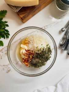 Start by gathering 3/4 cup of extra virgin olive oil, 1/4 cup apple cider vinegar, 1/4 cup of very finely grated parmesan, 1 finely grated clove of garlic, 1 tablespoon of mayonnaise, 1 teaspoon of honey, 1/2 teaspoon of dried oregano, 1/2 teaspoon of dried parsley, 1/2 teaspoon of dried basil, 1/2 teaspoon of salt, 1/4 teaspoon of celery salt, 1/4 teaspoon of black pepper and 1/4 teaspoon of crushed red pepper flakes.