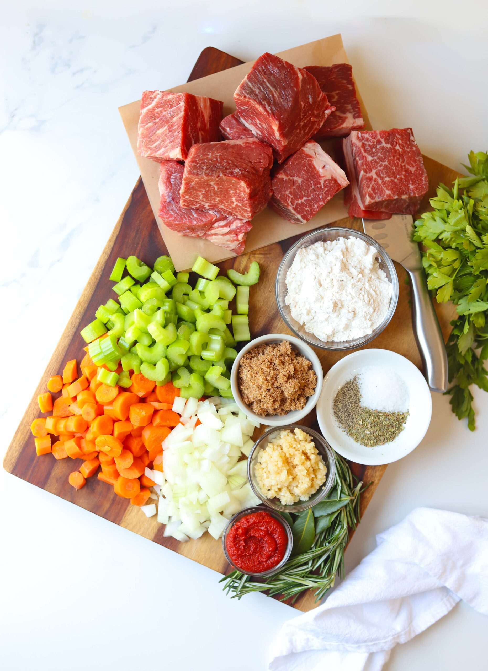 - Cut the chuck roast into 2 inch cubes and pat dry with paper towels