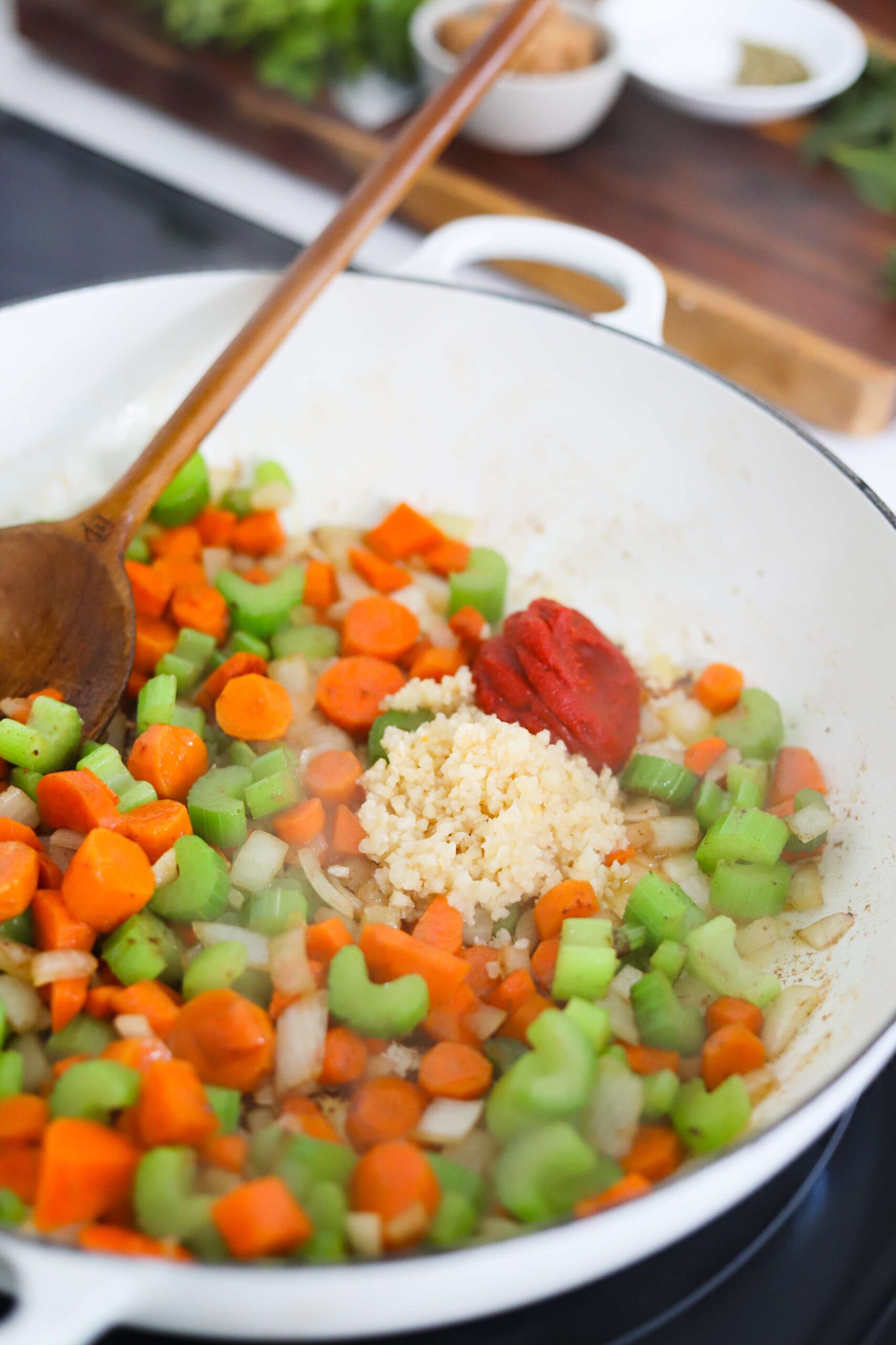 Now, add 6 cloves of finely minced garlic and 3 tablespoons of tomato paste and mix in with the softened onions, carrots and celery.