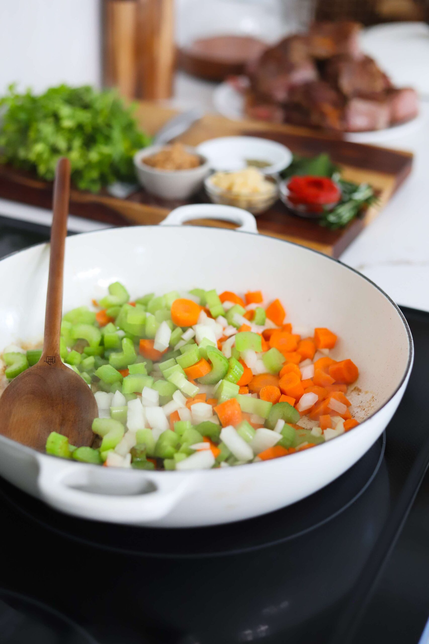 - Add the chopped yellow onion, carrots and celery and cook for about 5 minutes or until beginning to soften