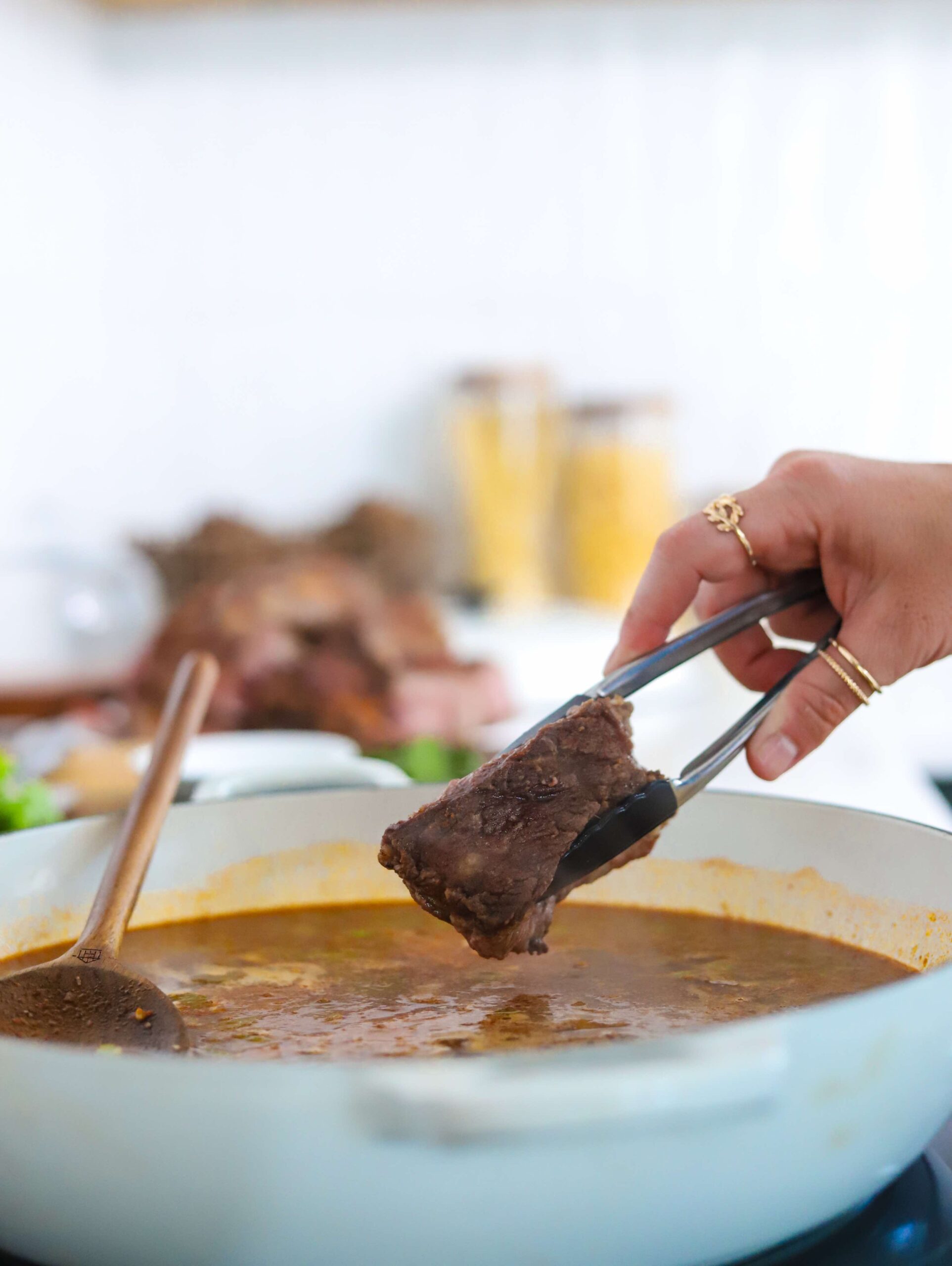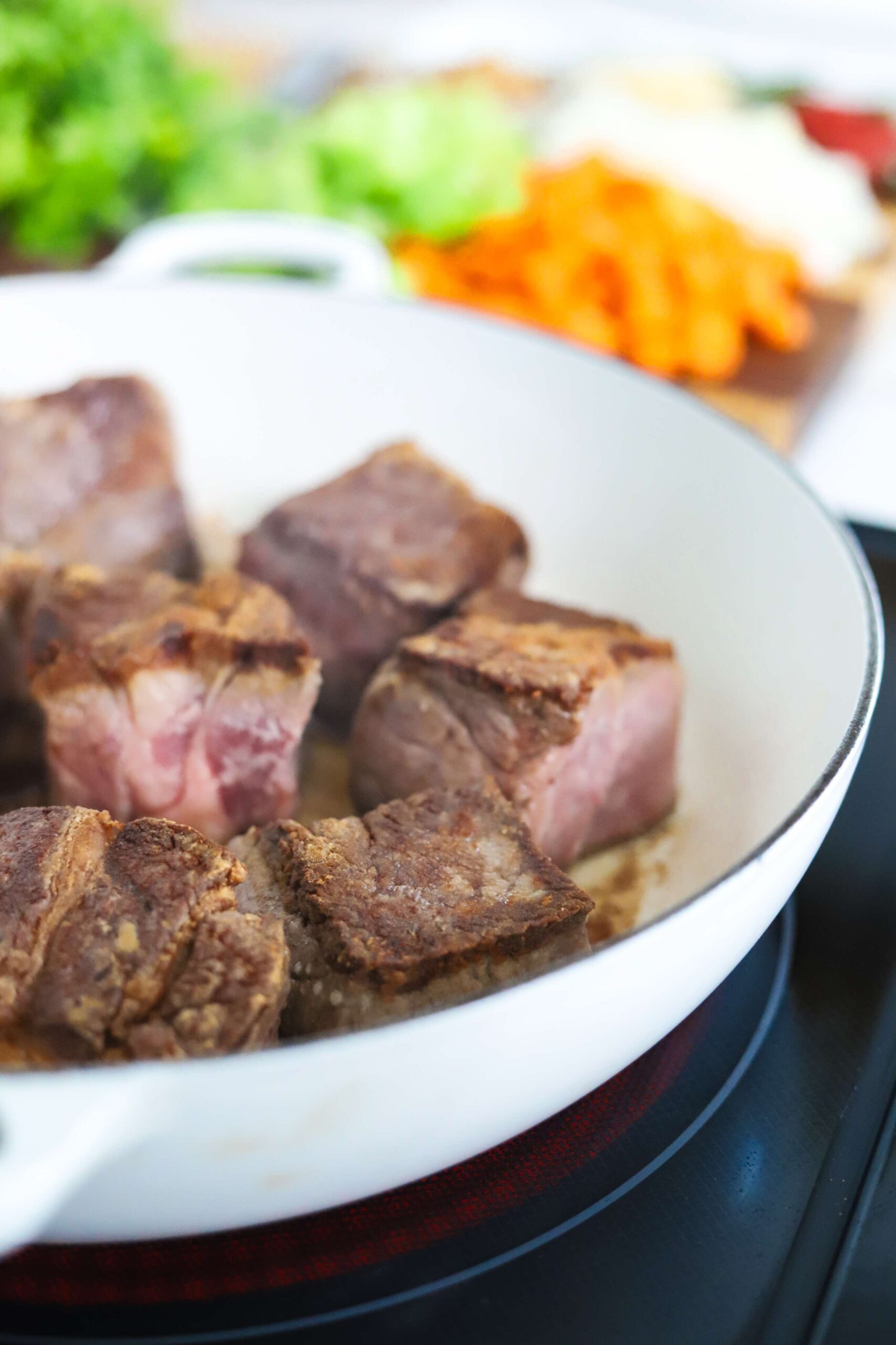 Place the beef into the braiser and let it sear for about 5 minutes undisturbed or until the underside has formed a nice crust. Carefully rotate the beef to the other side and continue rotating until all surfaces have been seared. Transfer the seared beef onto a plate and leave the braiser over medium heat.