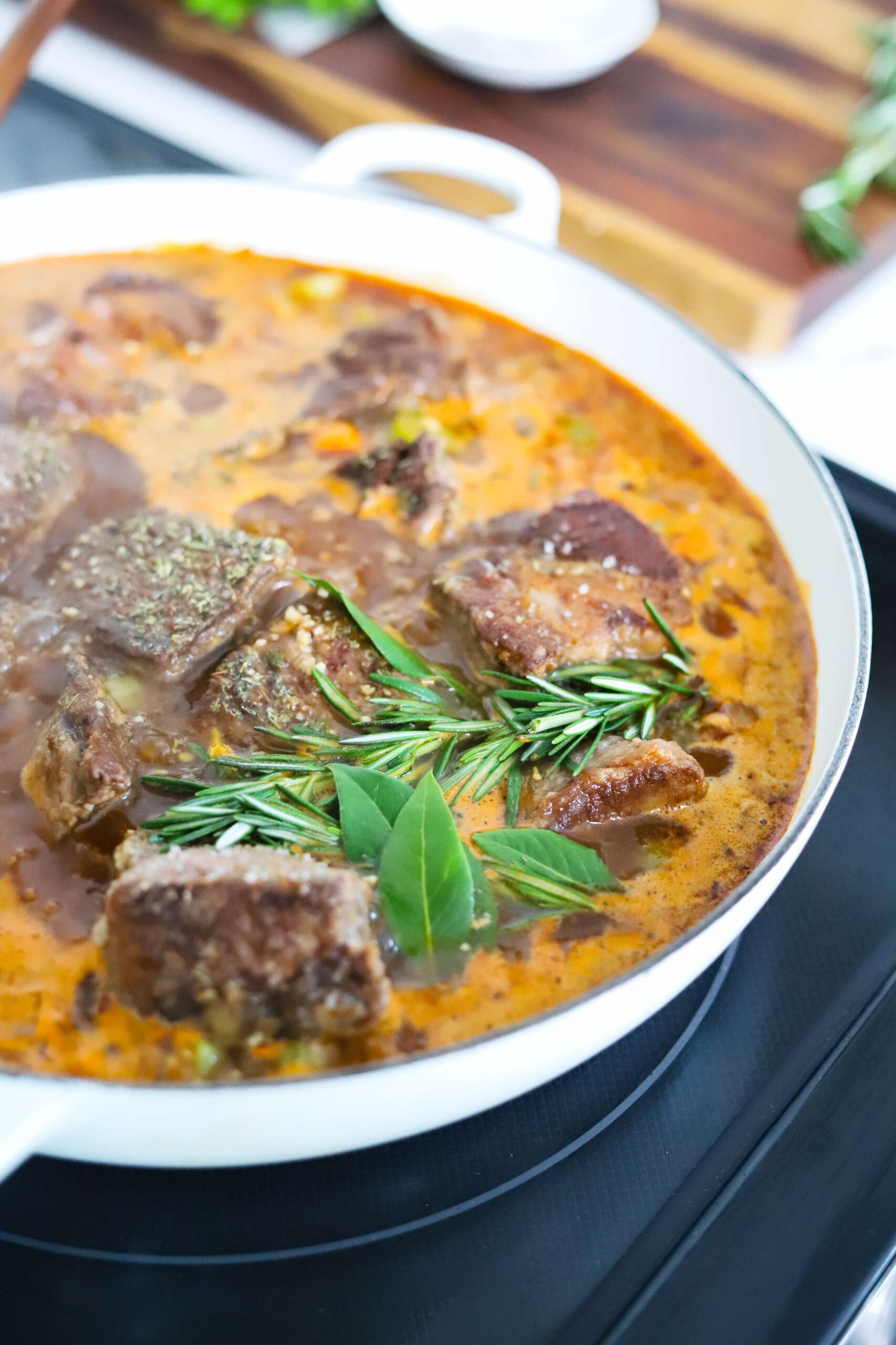 - Transfer the seared chuck roast back into the braiser along with 3 sprigs of rosemary, 10 sprigs of thyme and 3 bay leaves (or a teaspoon of dried herbs)