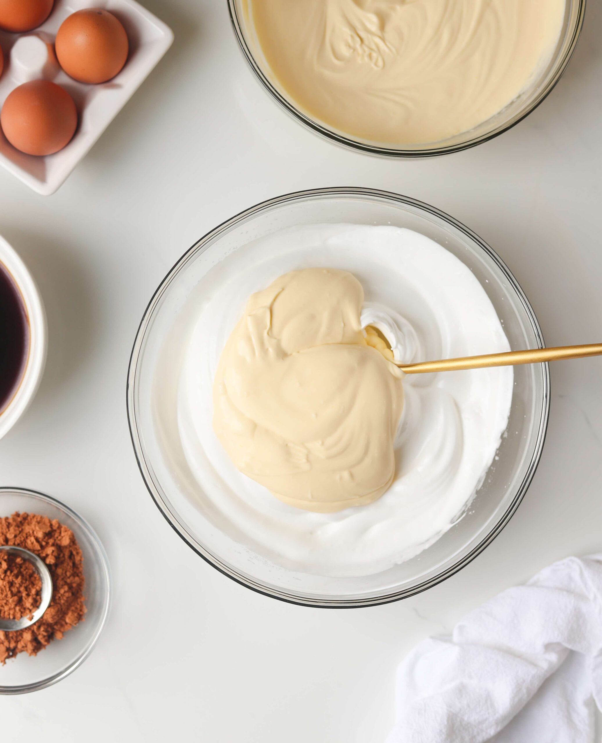 Gently fold the stiff egg whites into the mascarpone mixture until everything is fully combined.