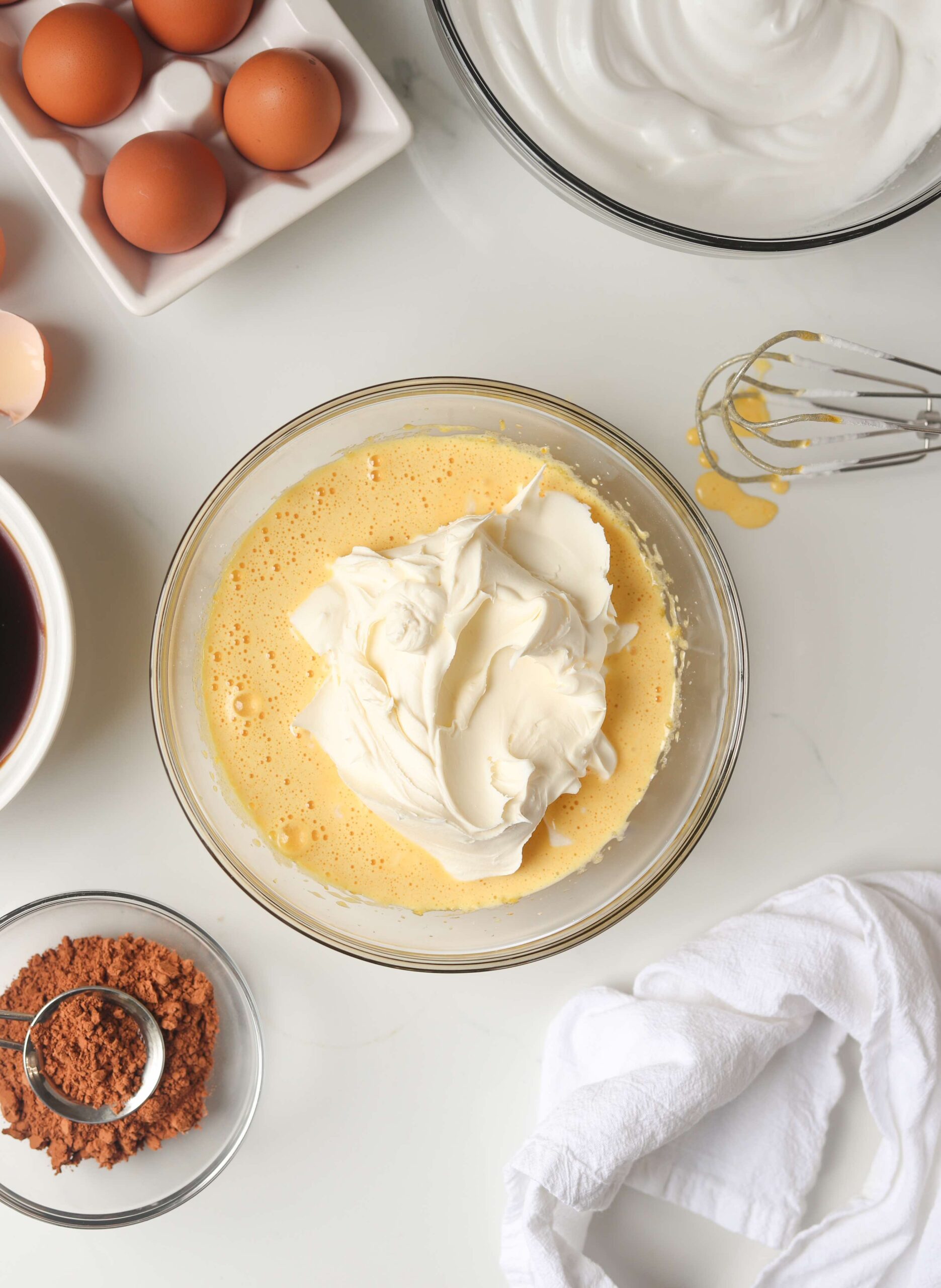 - Add about a third of the whipped egg whites, gently fold until mostly combined and repeat with the remaining egg whites until they have been all folded into the mascarpone mixture (be sure the fold gently to avoid deflating the egg whites)