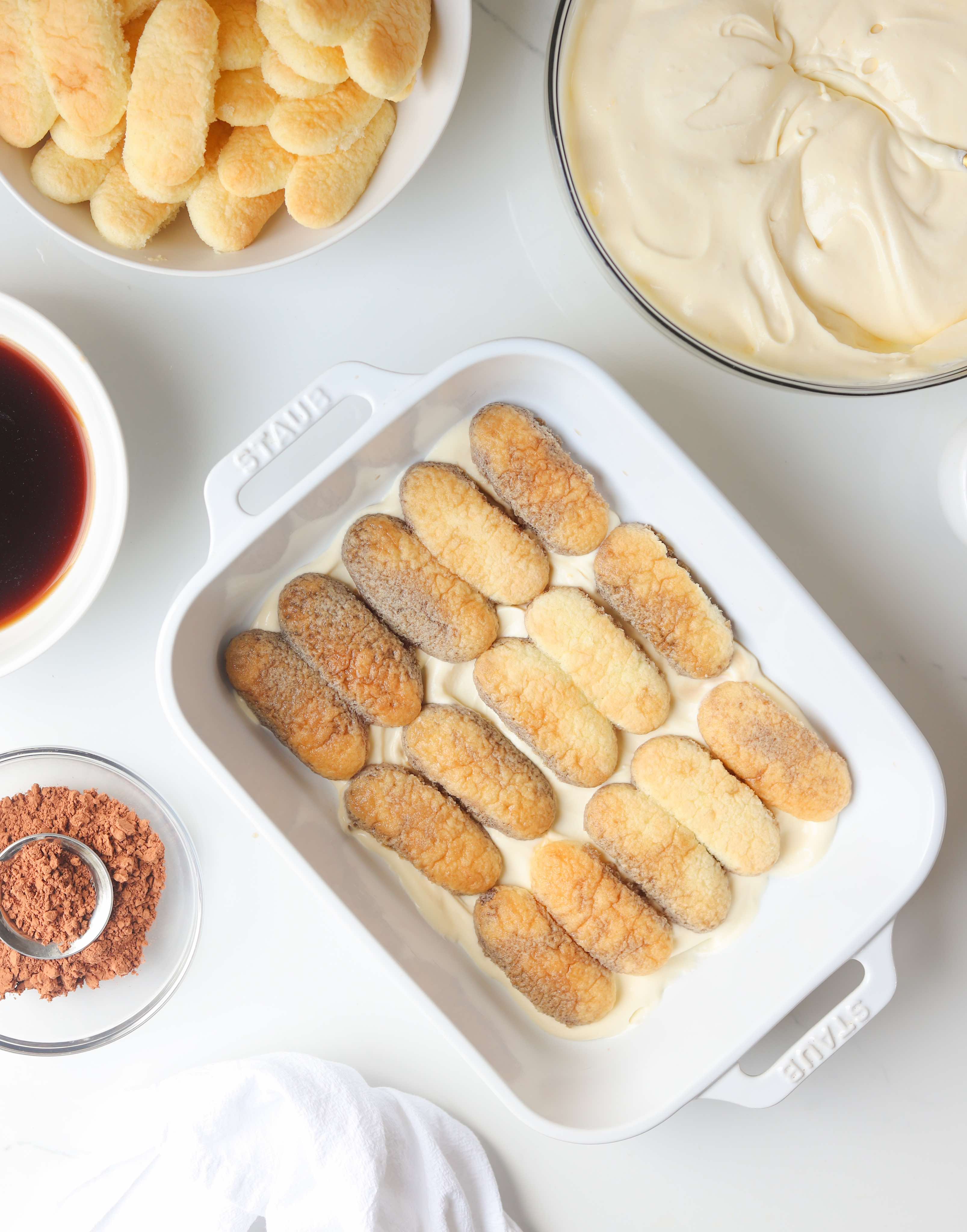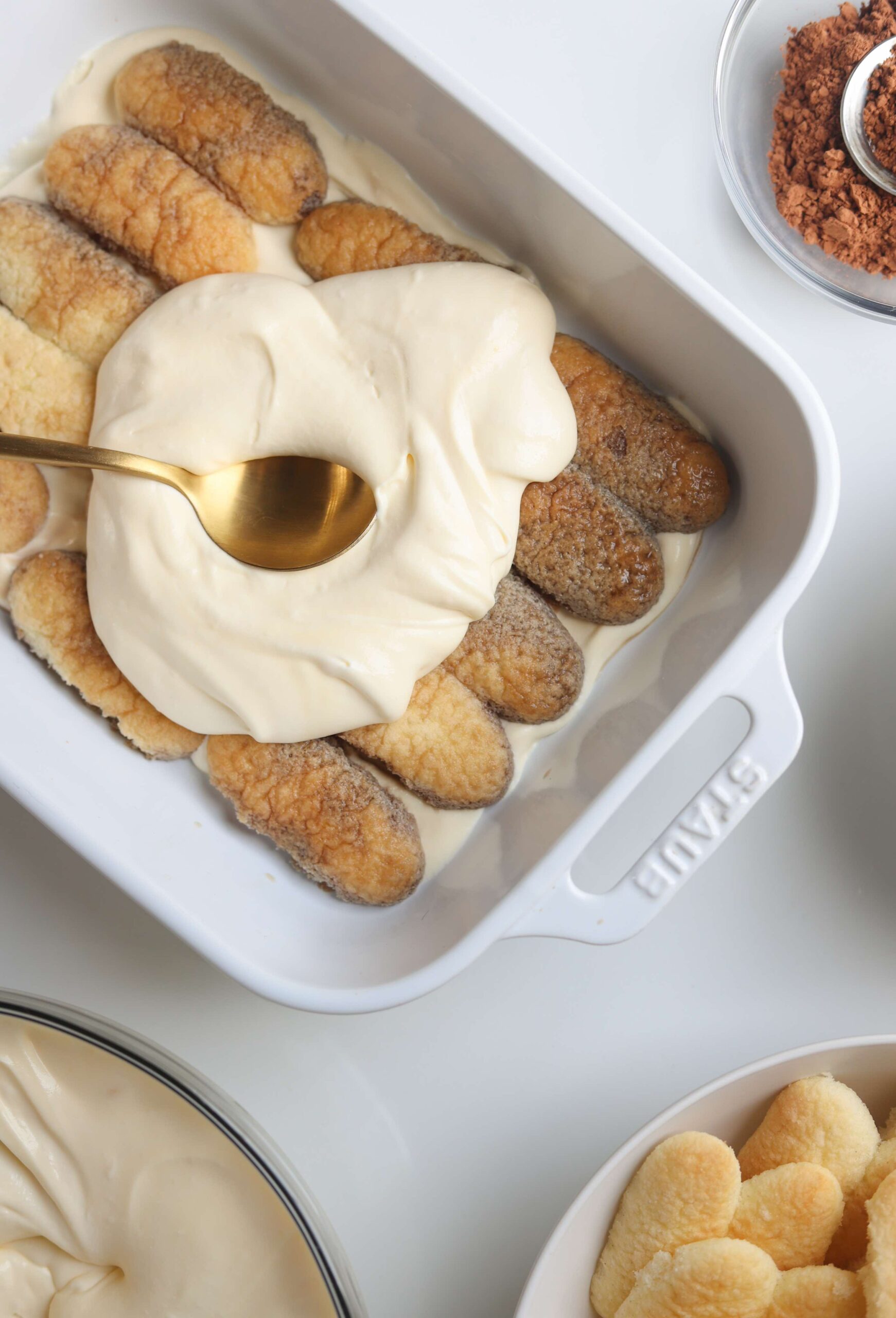 Place the lady fingers into your dish in a single layer and then add half or a third of the mascarpone filling depending on how many layers you want to create. I love making 3 layers to have an equal amount of ladyfingers and filling, but if you prefer more filling then just do 2 layers of lady fingers.