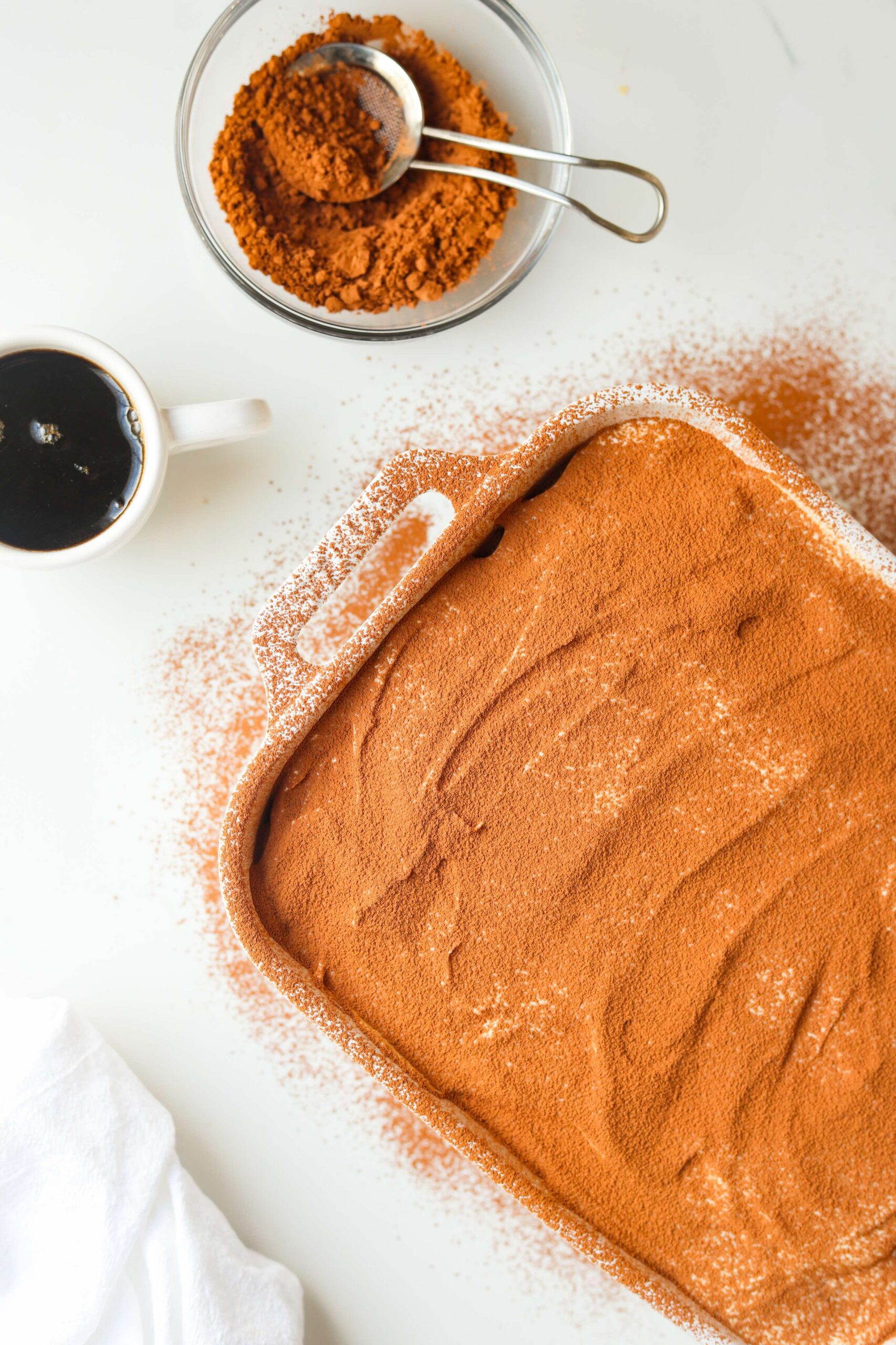 Once everything is assembled, generously dust the whole thing with cocoa powder and chill your tiramisu for a minimum of 4 hours to allow all of the flavors to develop and fully come together.