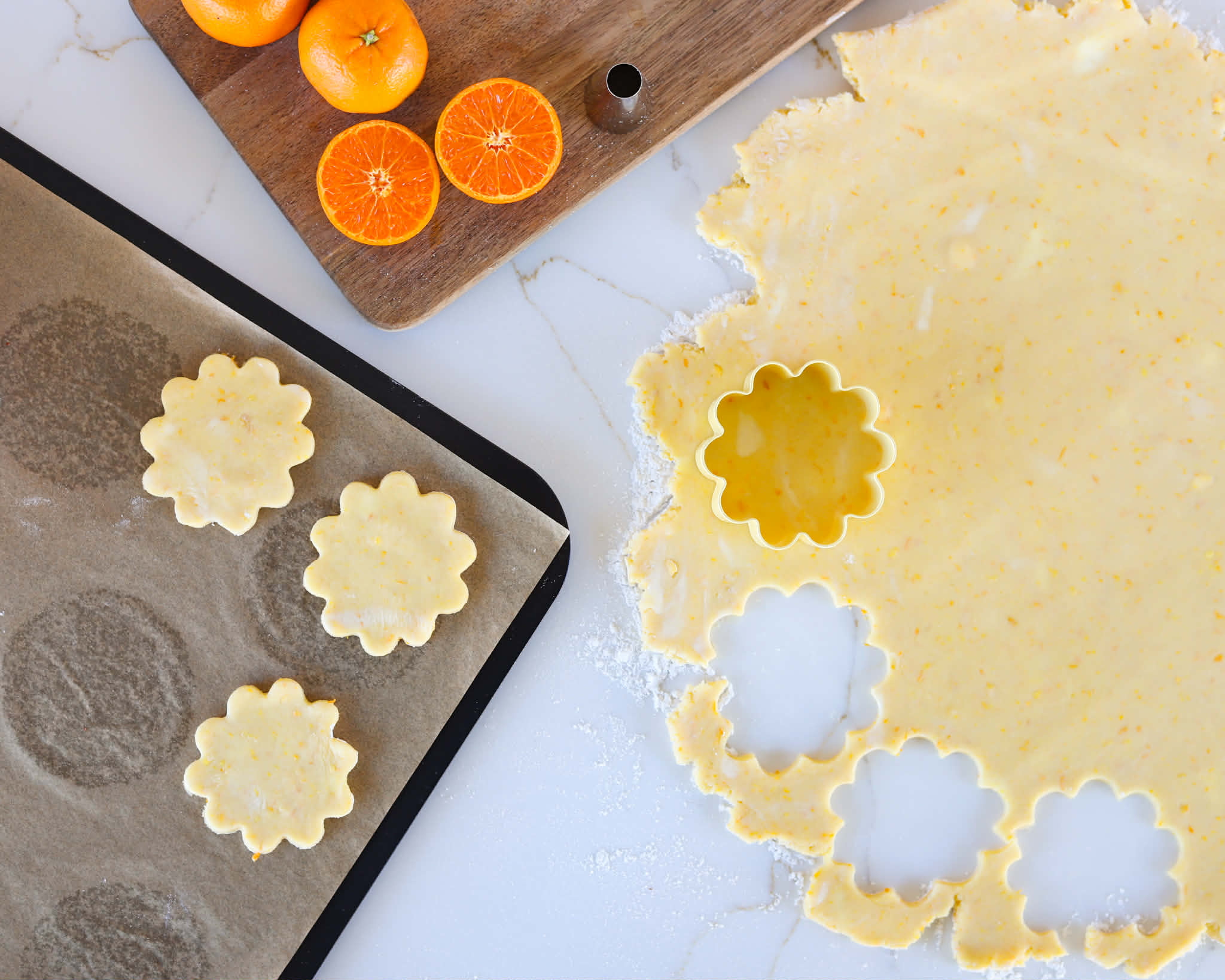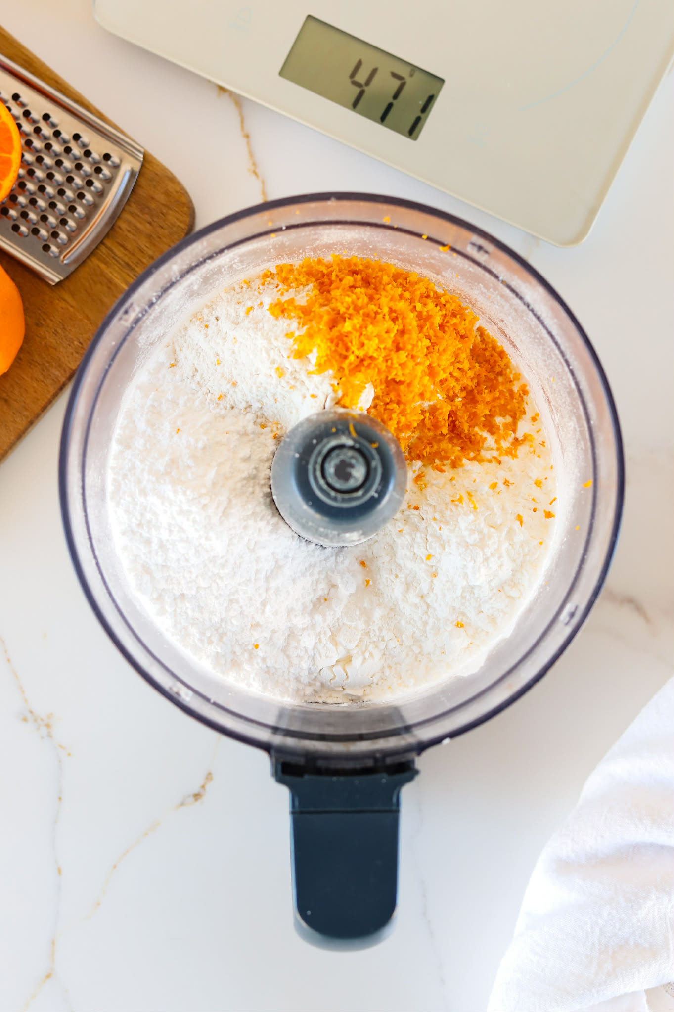 - Combine 130 grams of all purpose flour, 100 grams of cornstarch, 80 grams of confectioners sugar, 1 tablespoon of clementine zest and 1/4 teaspoon of salt in a food processor