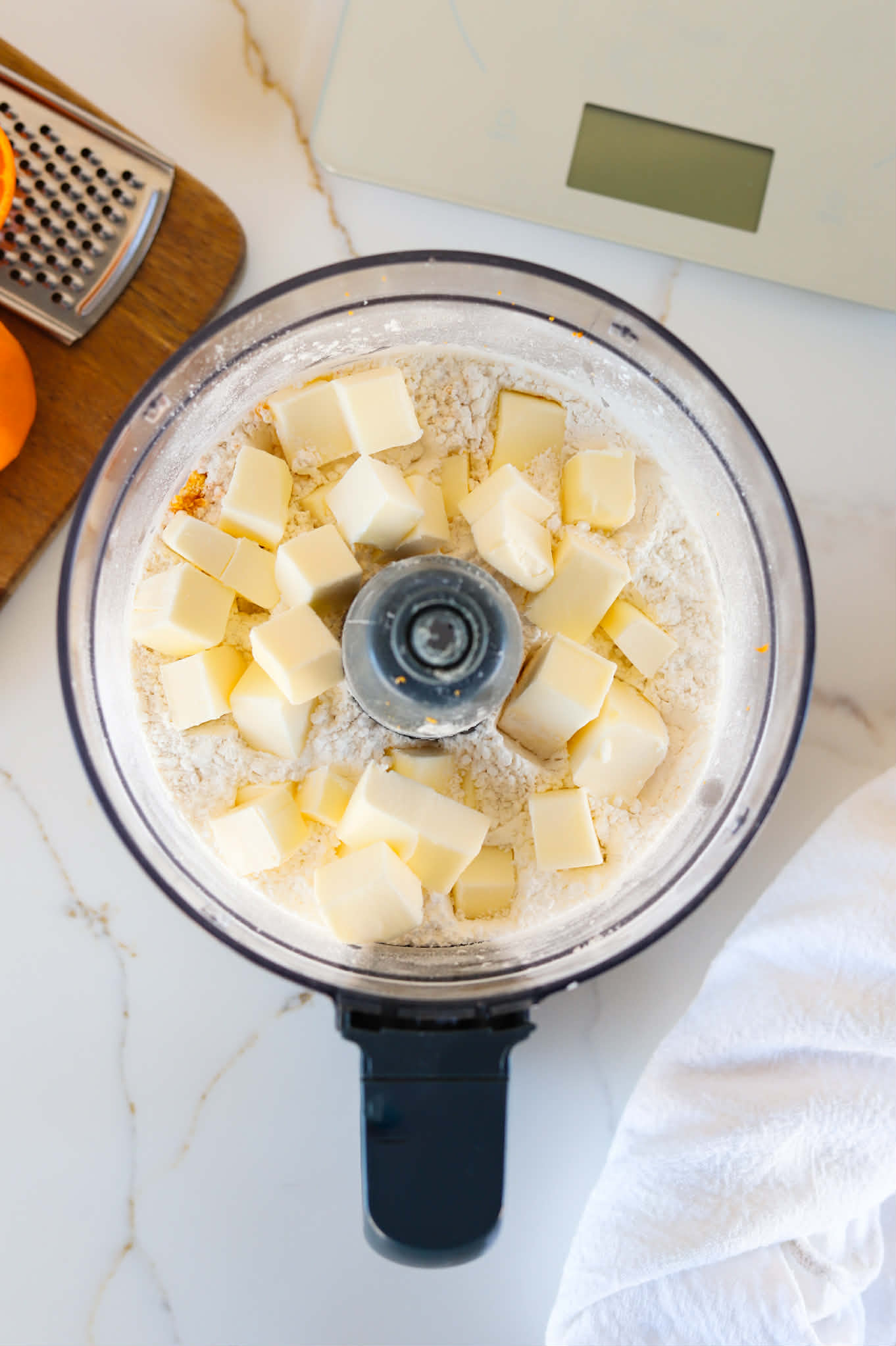 - Add 11 tablespoons of cold, cubed butter, 1 teaspoon of vanilla extract and 1/2 teaspoon of orange extract and pulse 4-5 times to combine