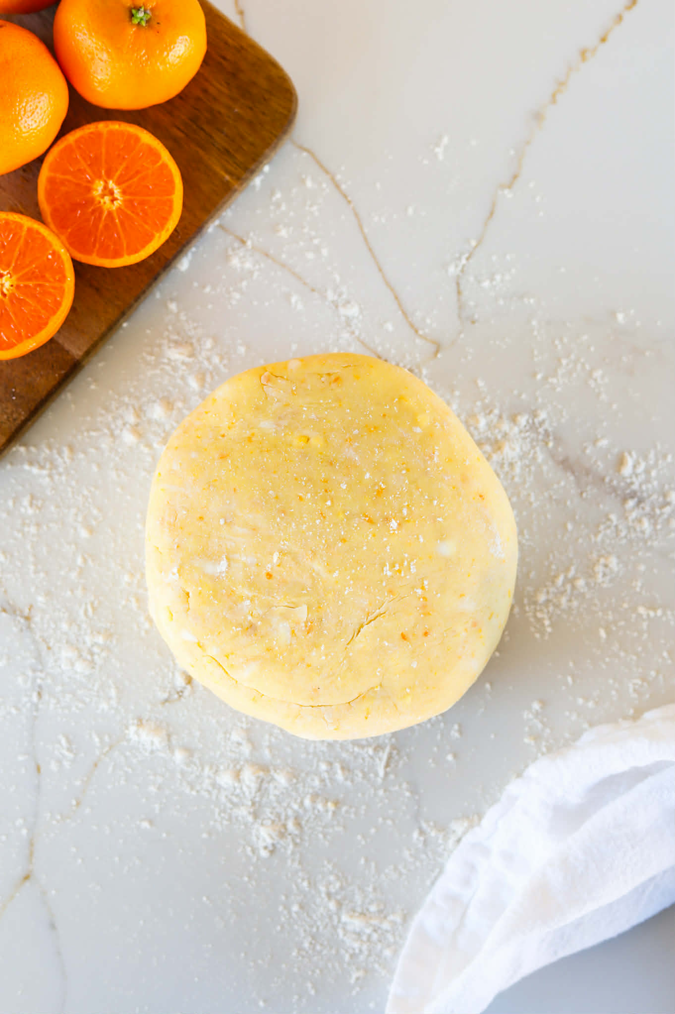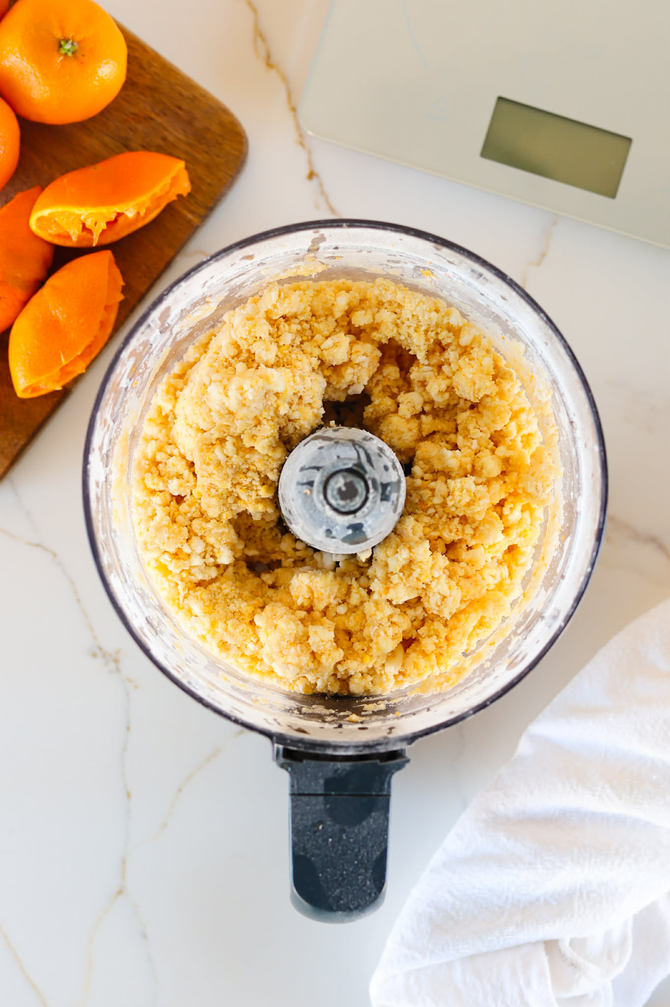 Gradually add fresh clementine juice a little bit at a time until you have a loose crumbly texture. This will take somewhere between 1 tablespoon and 4 tablespoons of clementine juice. If your clementines are really juicy and seedless, you can squeeze the juice directly into the dough. If not, juice them into a bowl and add the juice from there.