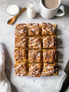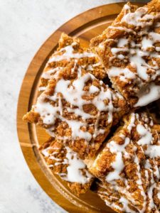 This coffee cake is moist, tender and full of warm cinnamon flavors. The crumble in the middle melts into the layers, but the crumble over the top gets a little crisp and shatters when you bite into it. The drizzle adds just the right amount of sticky sweetness to each bite making the whole thing simply perfect.