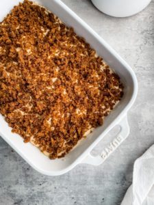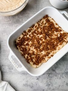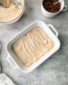 - Transfer one half of the cake batter into the baking dish and spread half of the crumble evenly over the batter