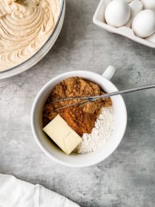 - Combine 1/2 cup of flour, 2/3 cup of brown sugar and 2 teaspoons of cinnamon in a small bowl and then add 4 tablespoons of melted butter and mix to combine into a loose crumble and set aside