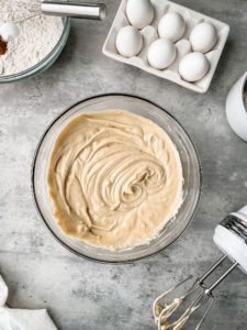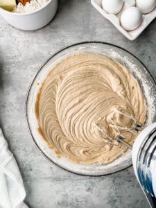 Begin by combining 1 cup of room temperature butter with 2/3 cup of granulated sugar, 1/2 cup of brown sugar, 1 cup of sour cream and 2 teaspoons of vanilla extract. Use an electric hand mixer, stand mixer or stiff whisk to combine. Add 2 large eggs and beat until fluffy and fully combined.