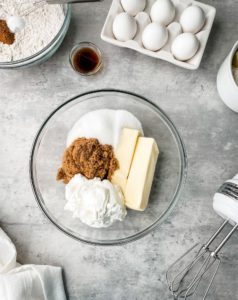 - In a large bowl, cream together 1 cup of room temperature butter with 2/3 cup of granulated sugar, 1/2 cup of brown sugar, 1 cup of sour cream and 2 teaspoons of vanilla extract with an electric hand mixer, stand mixer or stiff whisk