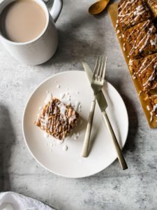 There is something really cozy about a warm slice of coffee cake. A tender, moist cinnamon flavored cake with a buttery cinnamon crumble layered through the center and over the top… it is the perfect way to celebrate anything from a Sunday morning to a Tuesday afternoon.